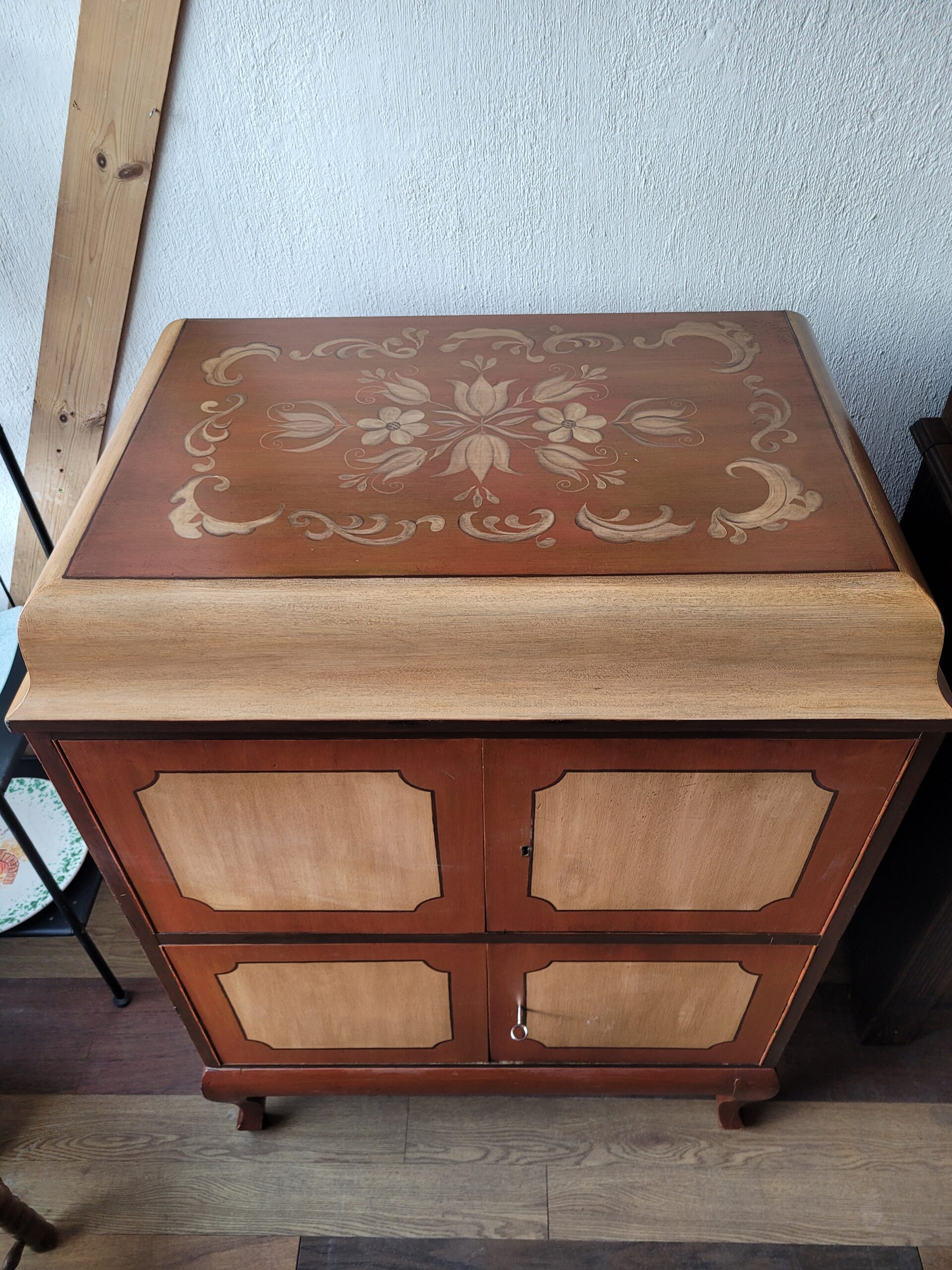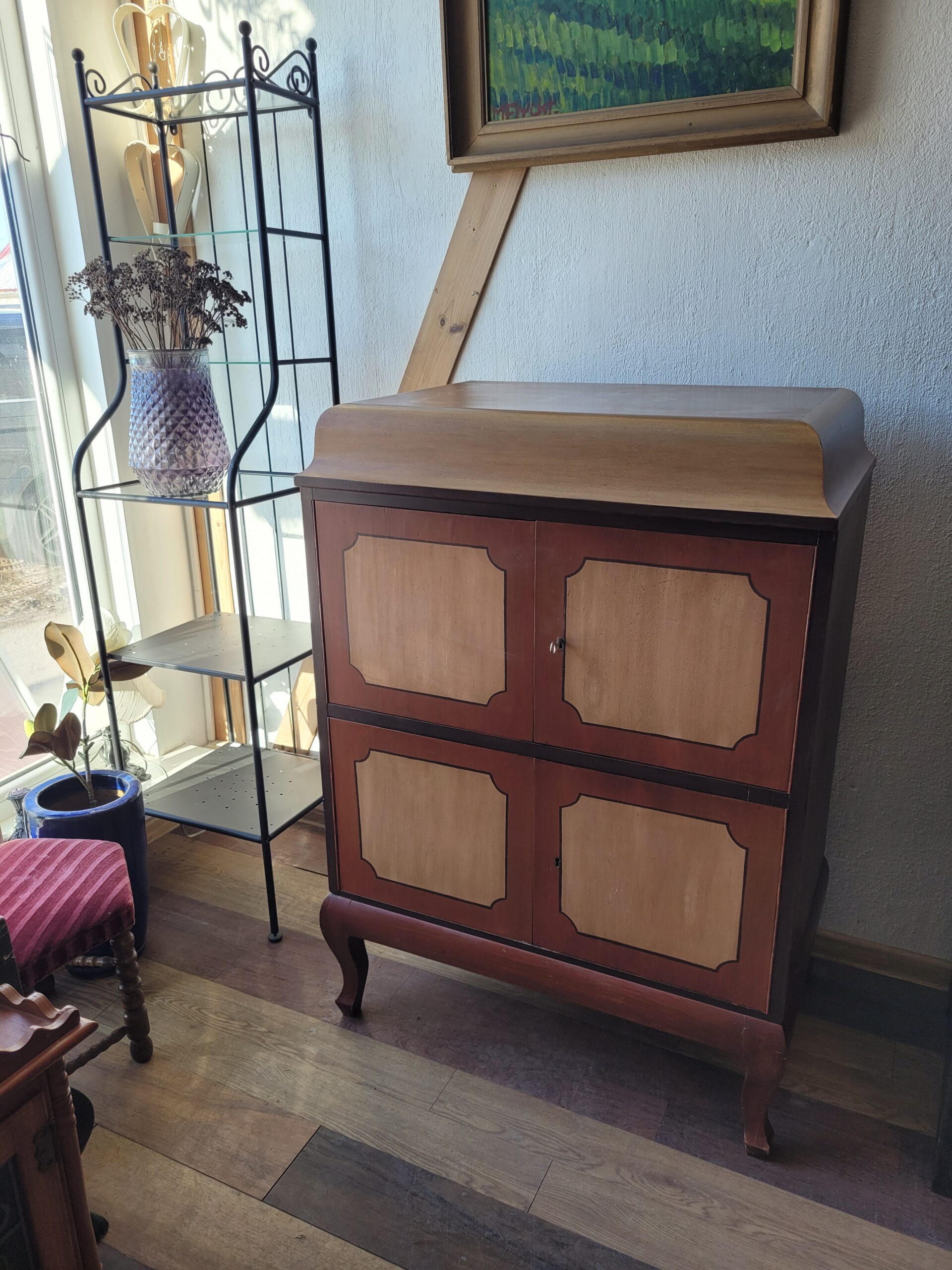 Tegemist on kauni vintage baarikapiga (cocktail cabinet), tõenäoliselt 20. sajandi keskpaigast (u 1940–1960ndad). Sellised kapid olid eriti populaarsed 1950ndatel, kui kodune külaliste võõrustamine ja kokteilikultuur olid moes.
