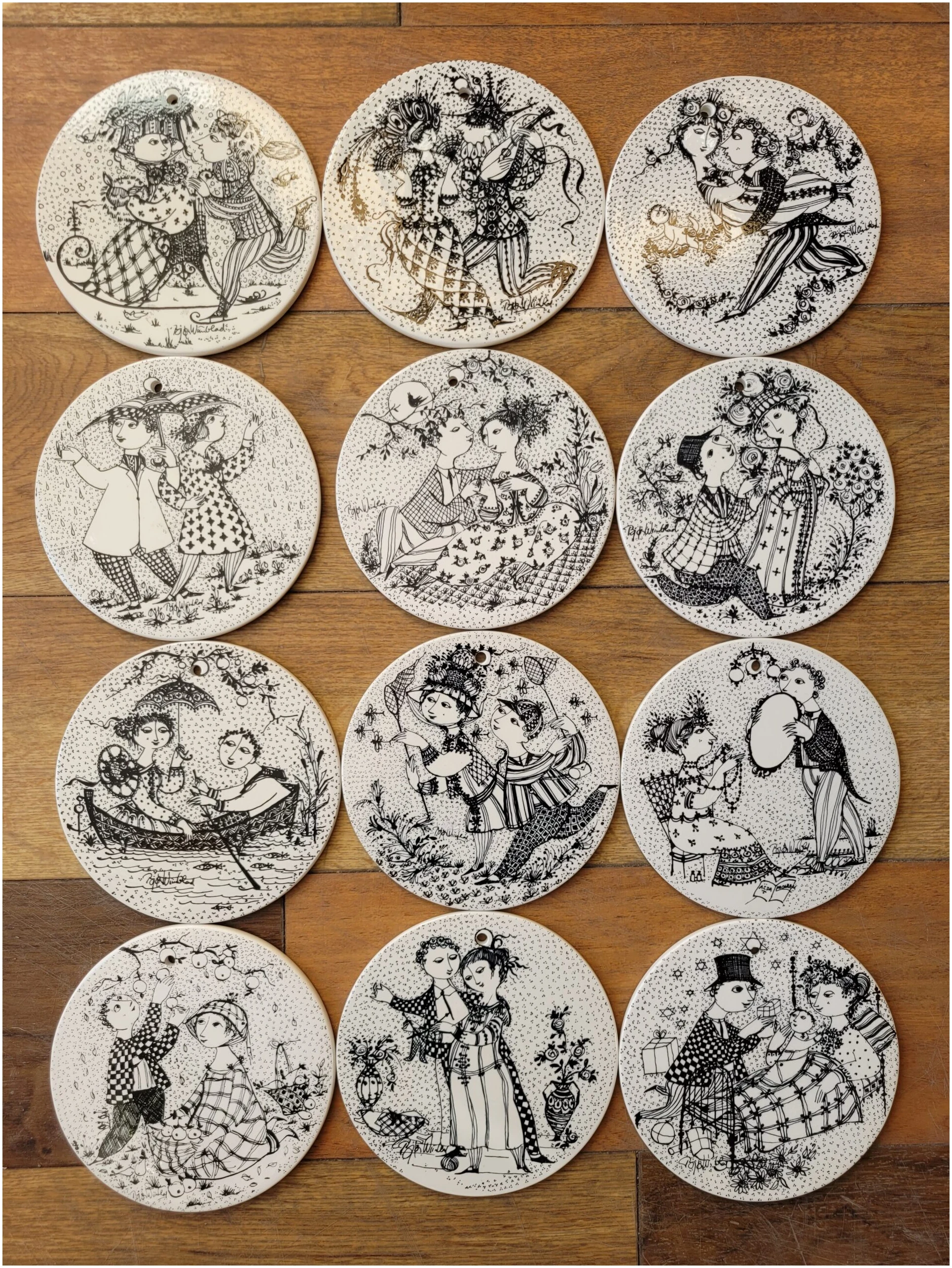 Taani kunstniku Björn Wiinblad “Twelve months of love” portselanist seinataldrikud/kuumaalused