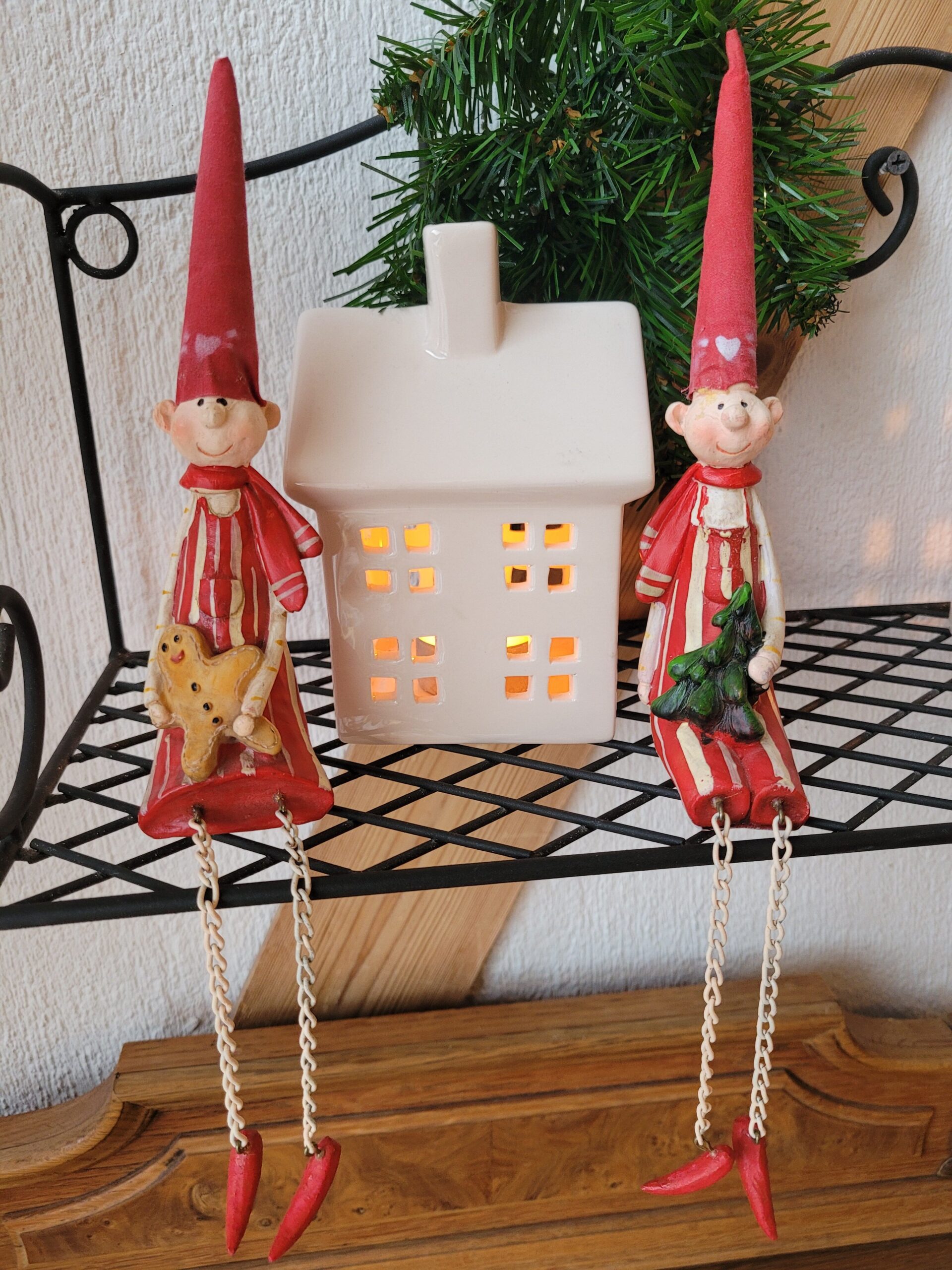 Armsad keraamilised päkapikud, mis toovad koju jõuluhõngu. Üks hoiab käes piparkooki, teine väikest kuusekest. Päkapikud on mõeldud riiulile või lauaservale istuma — nende jalad ripuvad dekoratiivselt üle ääre. Lõbus ja südamlik lisand jõulukaunistustesse.