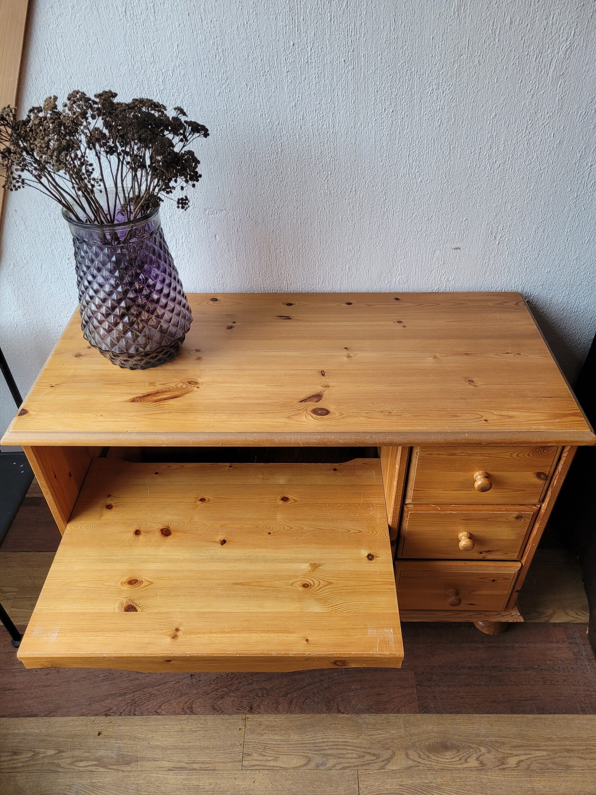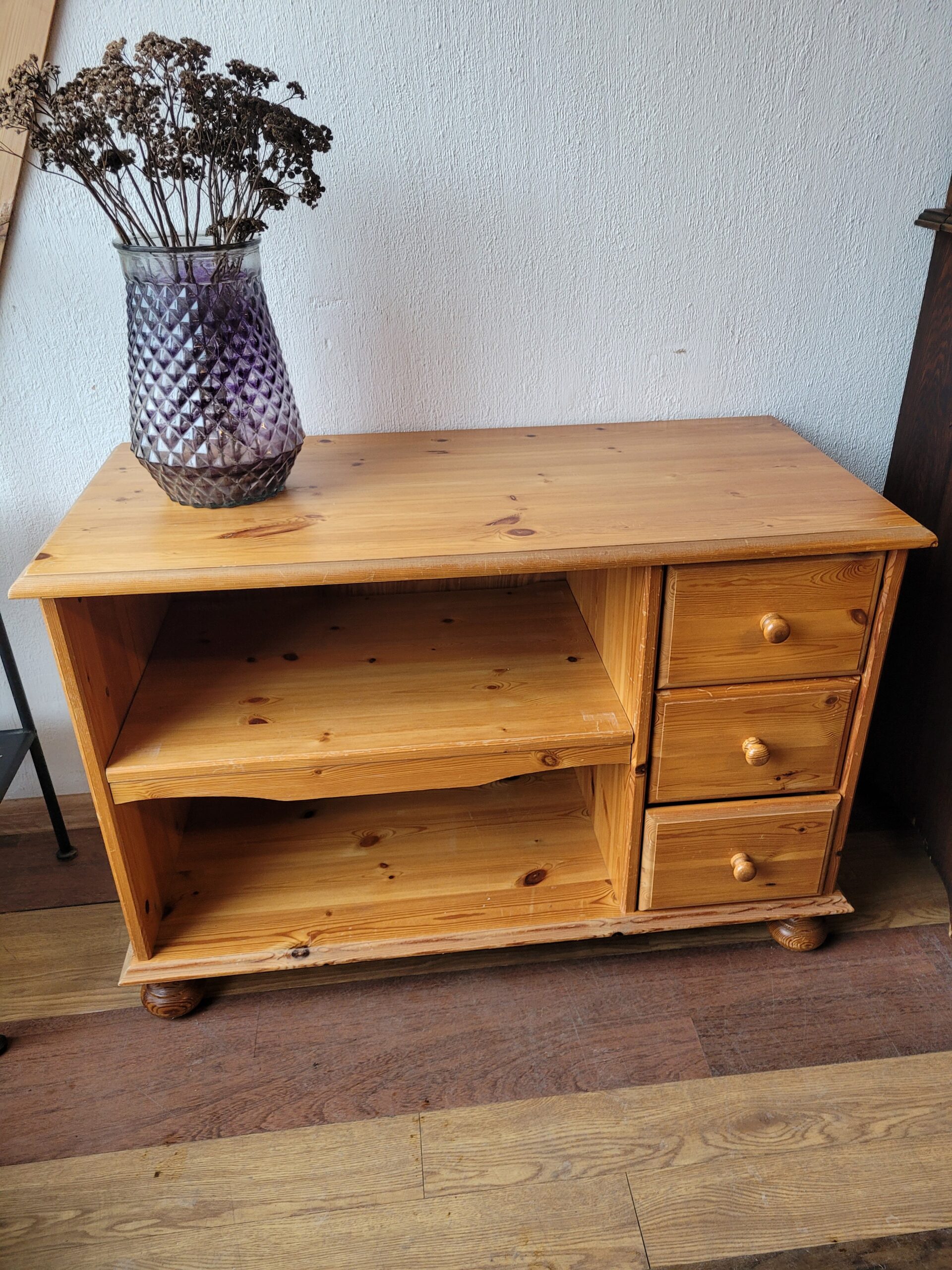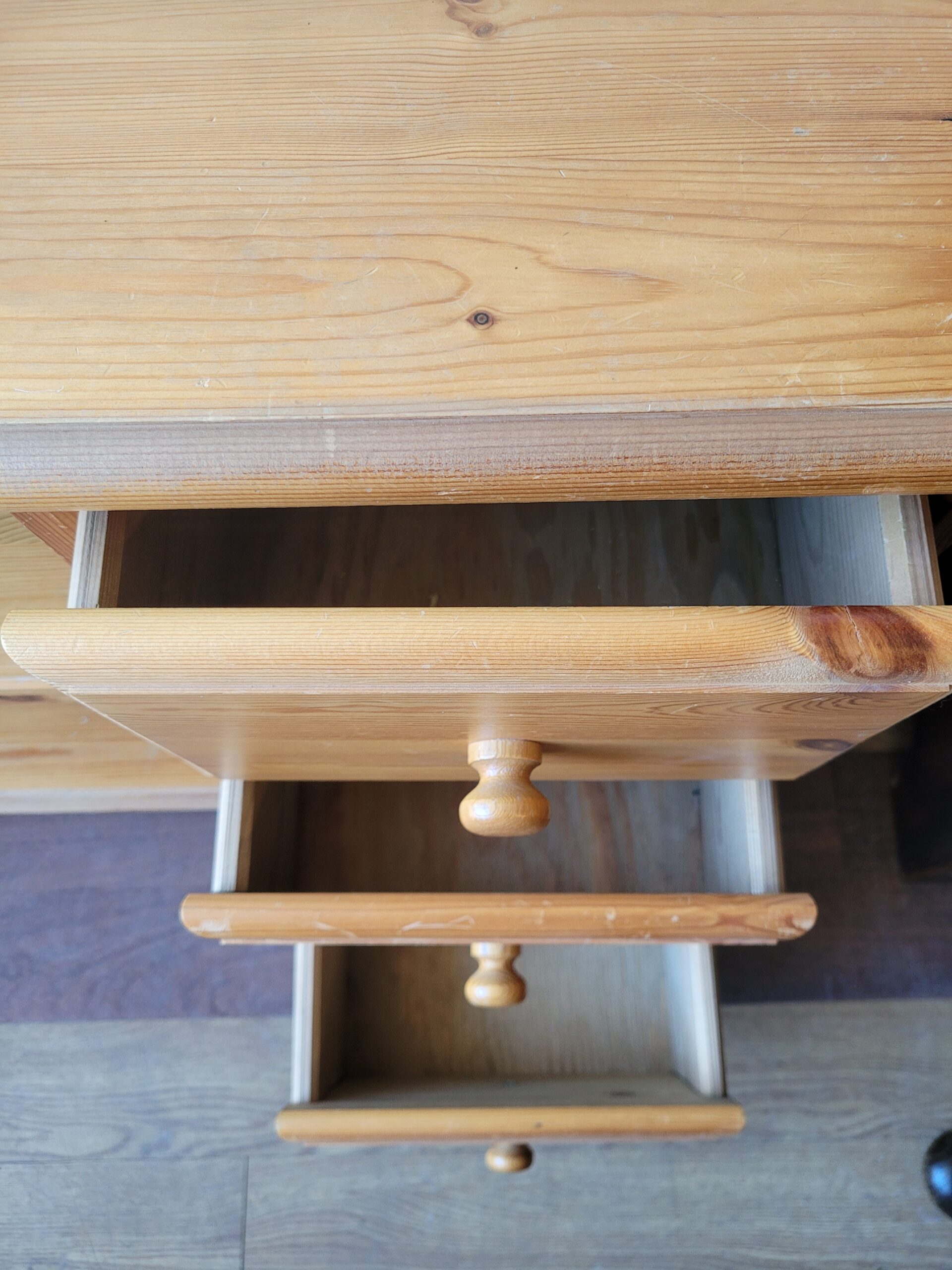 Männipuidust kummut kolme sahtli ja väljasõitva riiuliga.