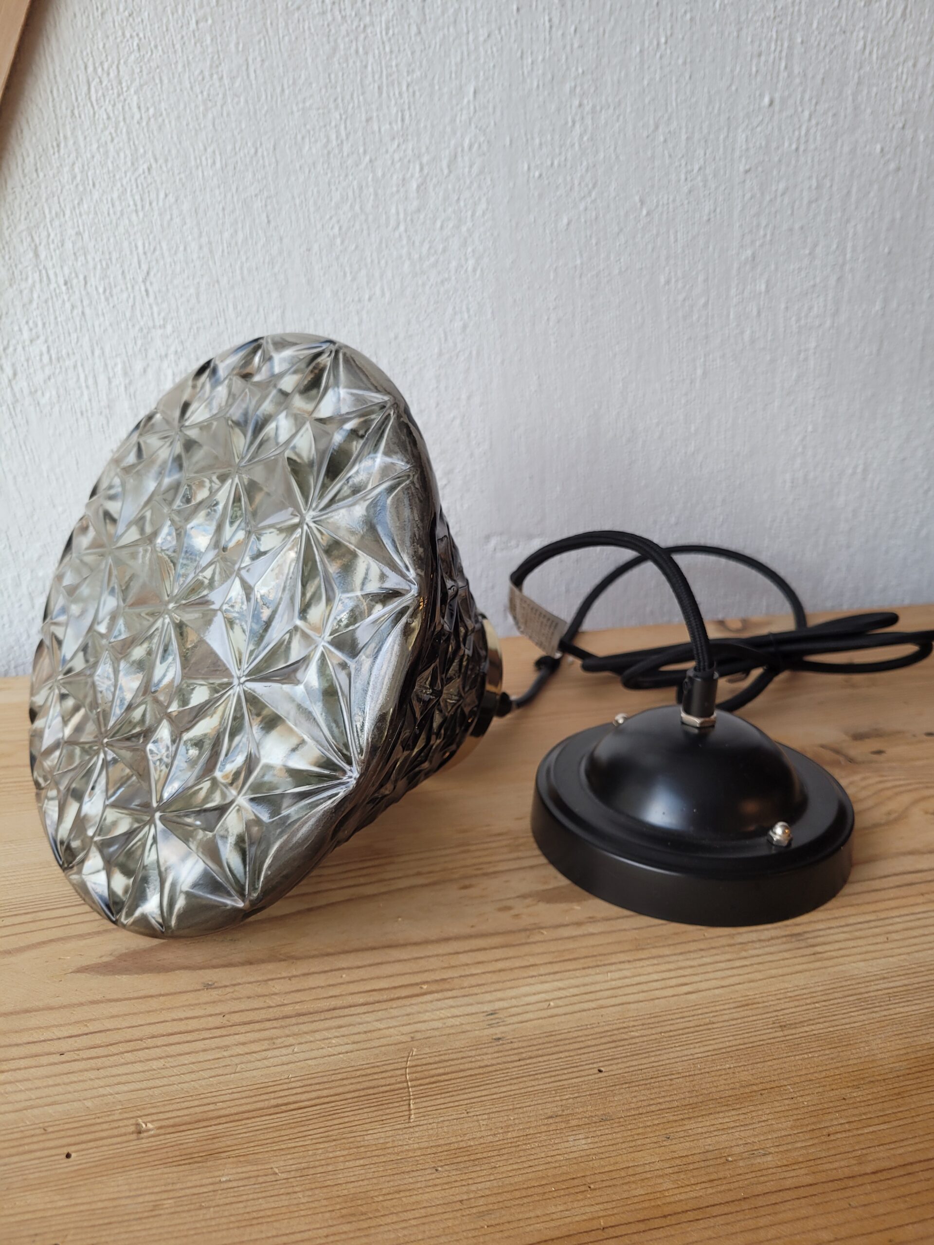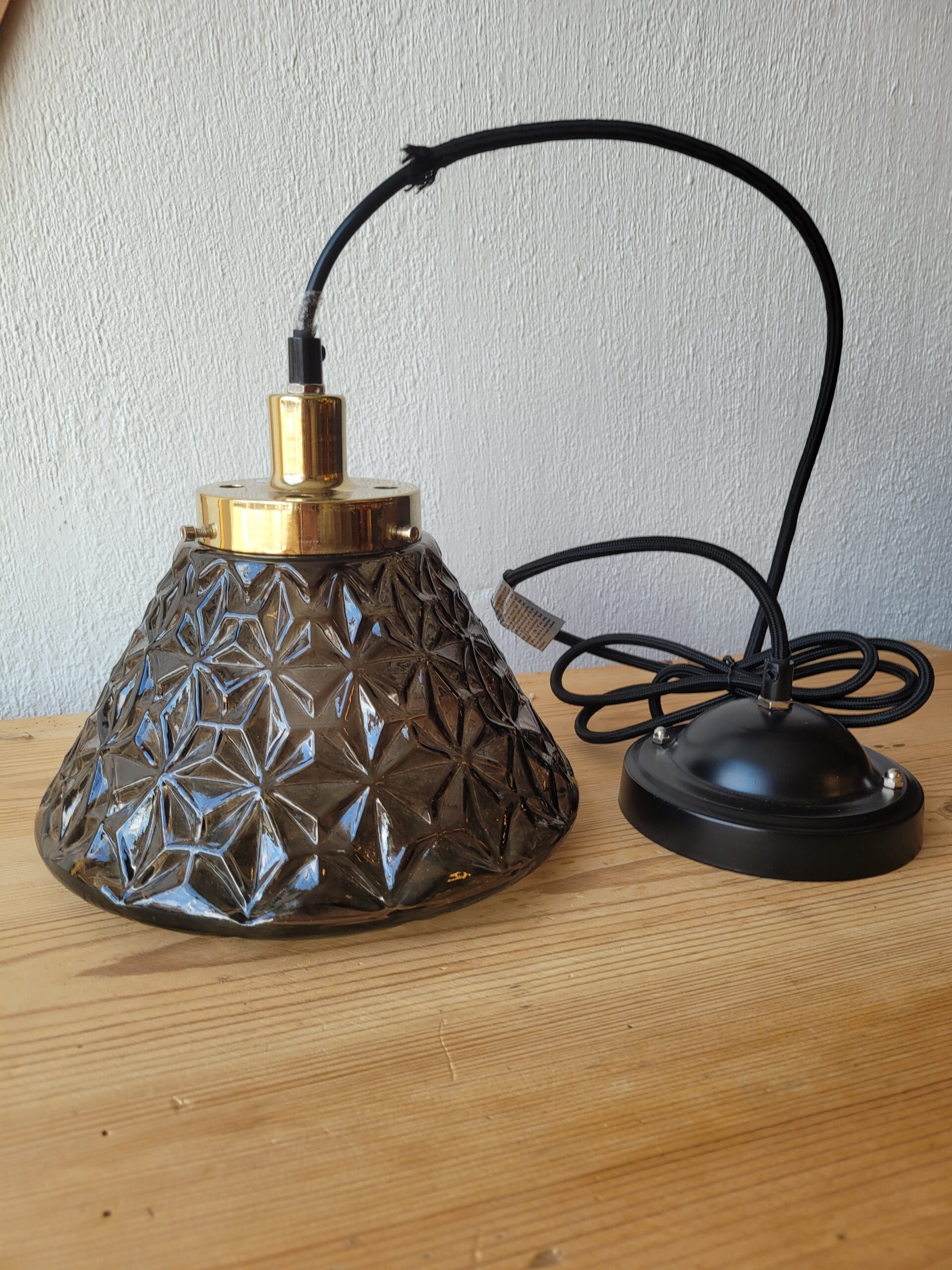 Elegantne laevalgusti, mis ühendab ajatu disaini ja hubase valguse. Lambivari on valmistatud suitsutooniga klaasist ning kaunistatud reljeefse geomeetrilise mustriga, mis loob sügava ja mängleva valgusefekti. Messingist detailid lisavad soojust ja luksuslikku viimistlust. Lambipesa E14