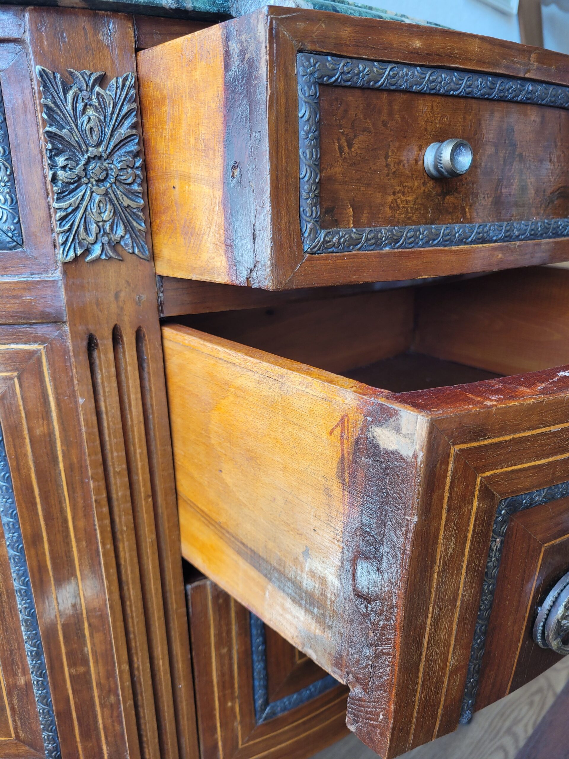 See kaunis Louis XVI stiilis konsoolkapp (18.–19. sajandi stiil) ühendab klassikalise vormi ja luksusliku materjali – täispuit, rohelise varjundiga marmorplaat ja peened intarsiad ning nikerdused.