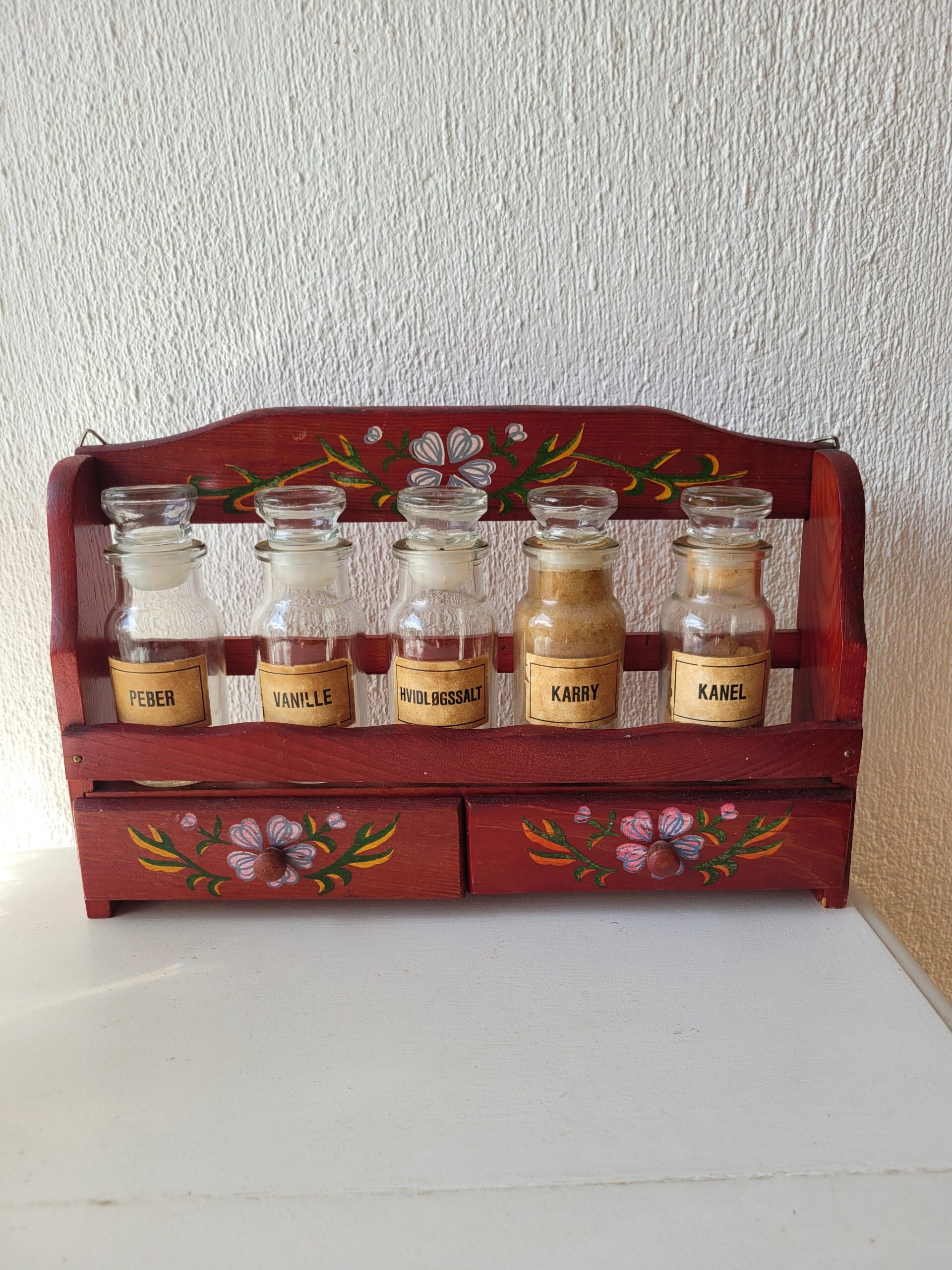 Imearmas maalitud puidust maitseaine riiul koos klaasist vintage maitseainepurkidega. Riiulil on lisaks väiksed sahtlid, kuhu mahub näiteks mõni maitseainepakk.