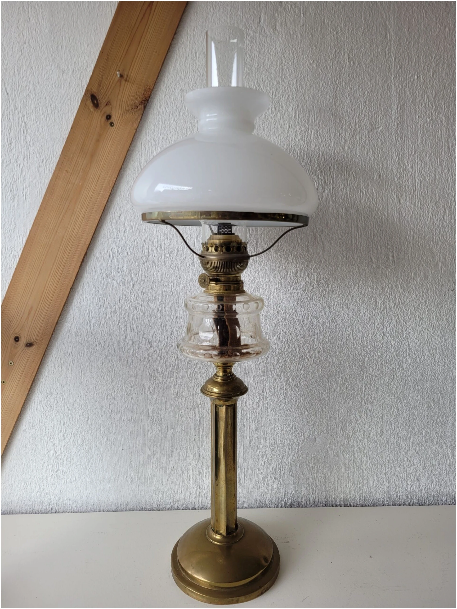 Antiikne (aastast 1850…)  petrooleumlamp klaasist kupliga – lisab vanakooli šarmi teie interjöörile. Selle unikaalne disain ja pehme valgus loovad nostalgilise atmosfääri igas ruumis.