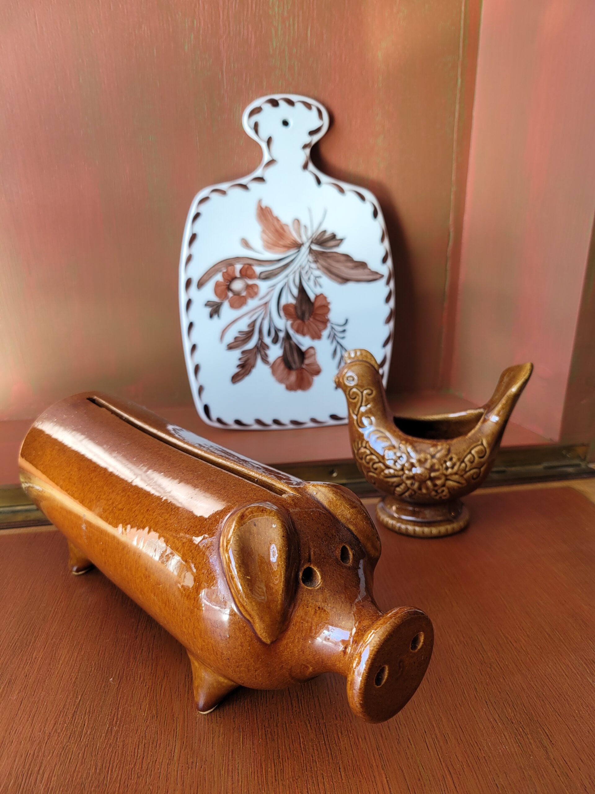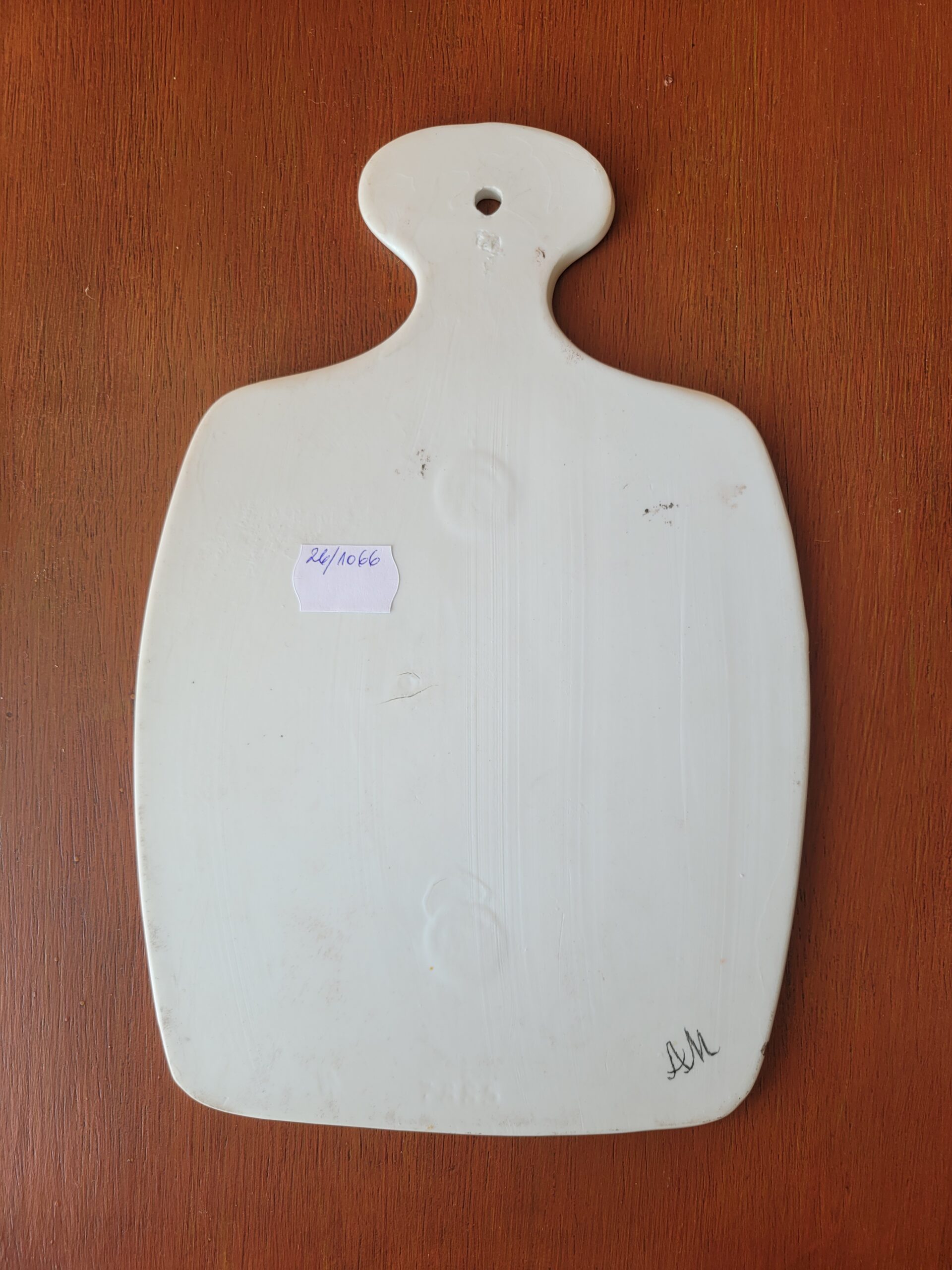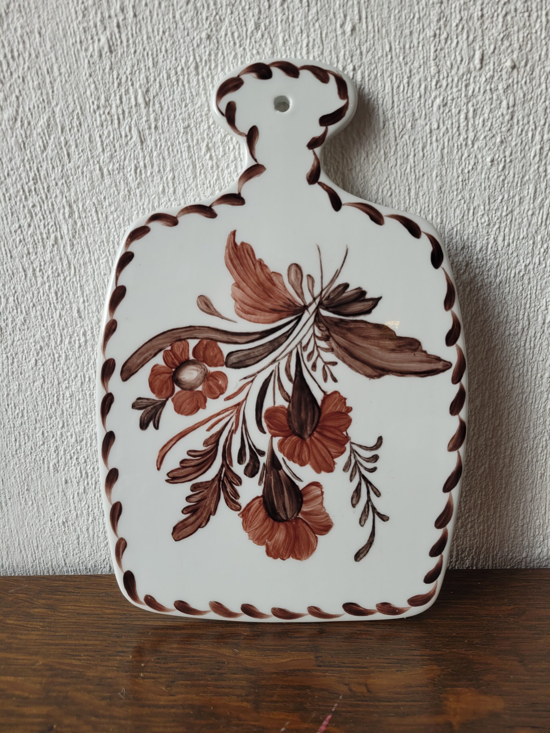 Portselanist lõikelaud, millel on käsitsi maalitud pruunides ja punakaspruunides toonides lillemotiivid. Ülaosas on riputusava, mis võimaldab lõikelauda seinale paigutada – see muudab selle ka köögis kauniks sisustuselemendiks.