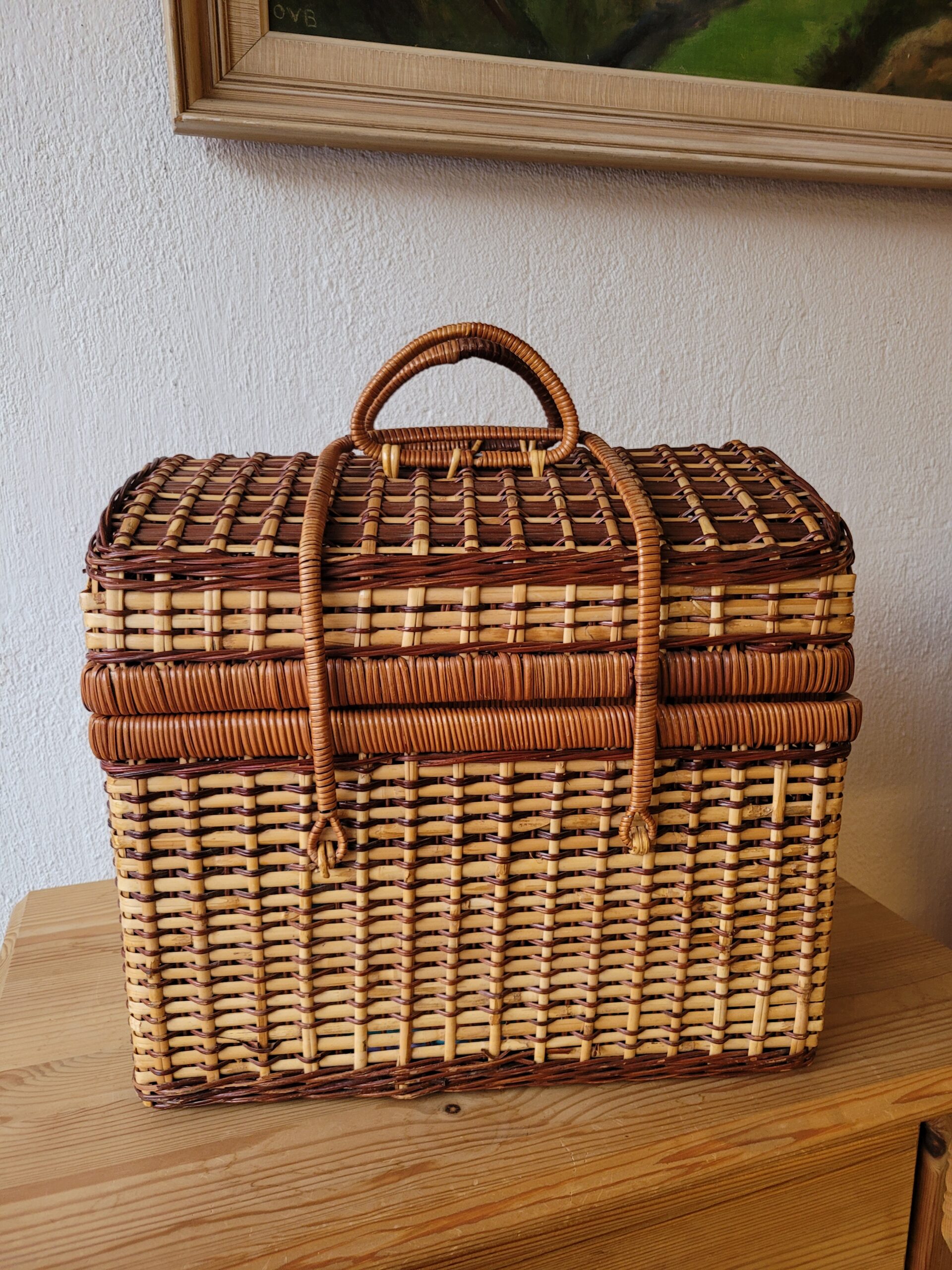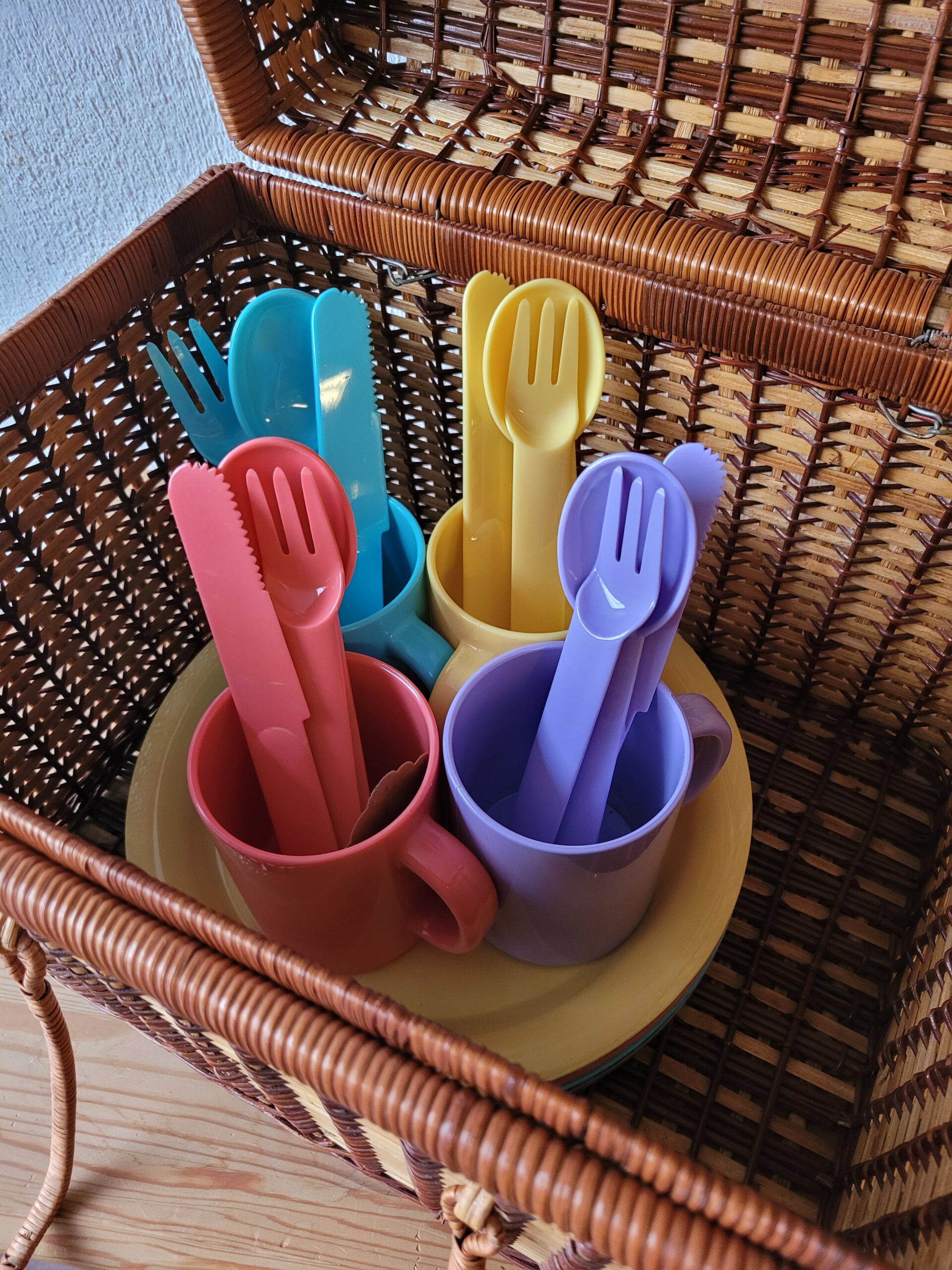 Vintage piknikukomplekt neljale inimesele. Komplekti kuulub punutud korv pealt avaneva kaanega ning plastik sööginõud (4 teelusikat, 4 kahvlit, 4 nuga ja 4 taldrikut). Väga heas seisukorras.