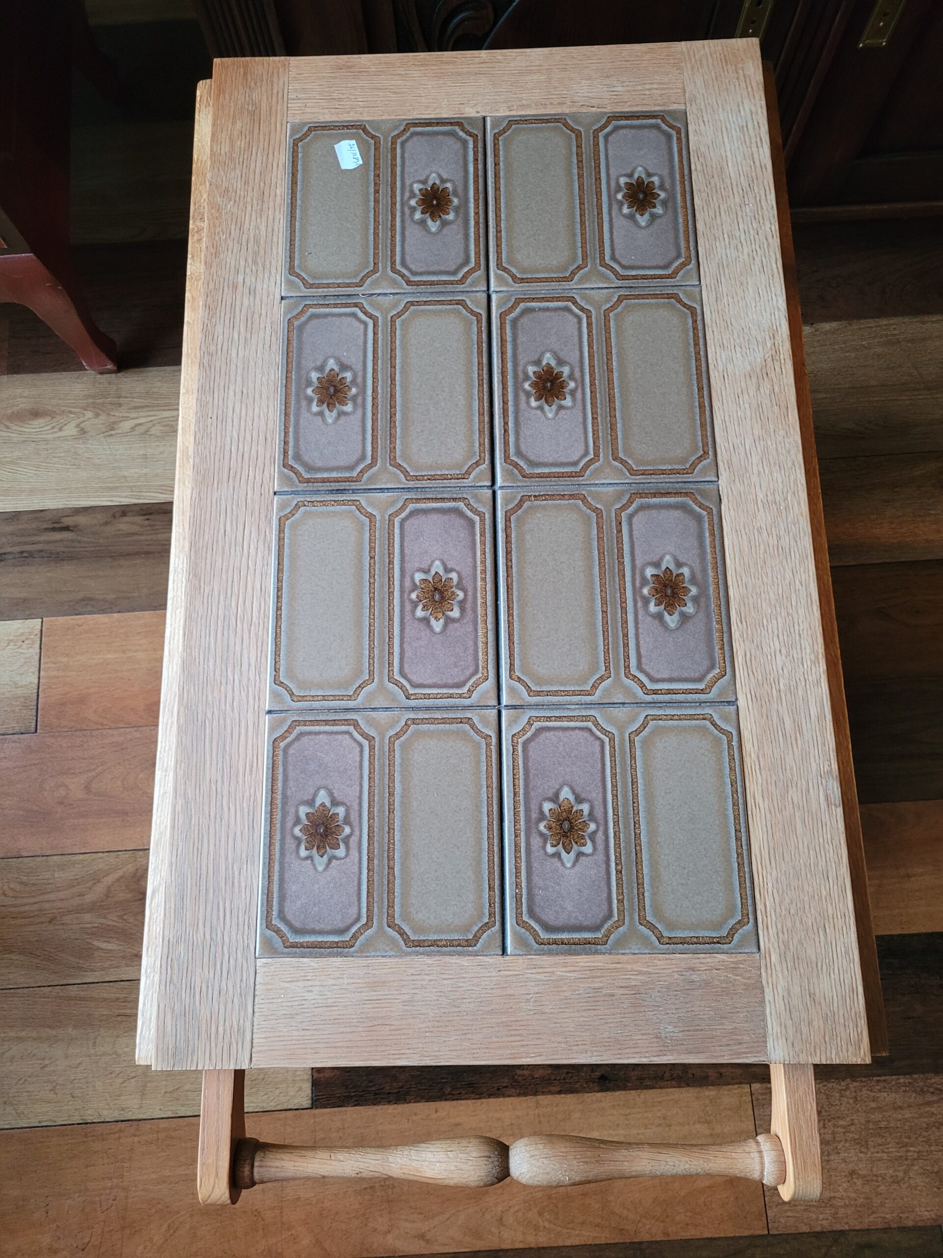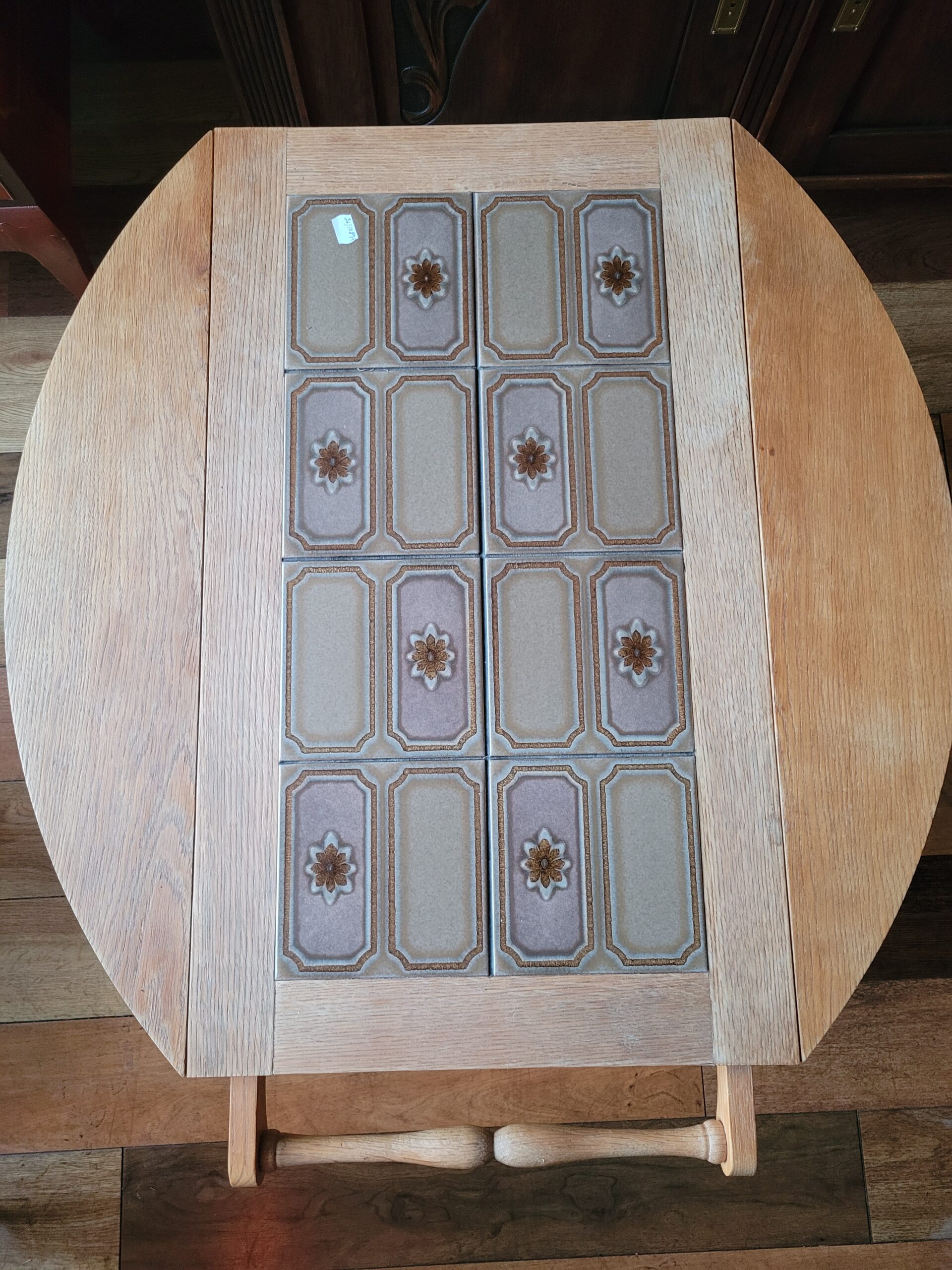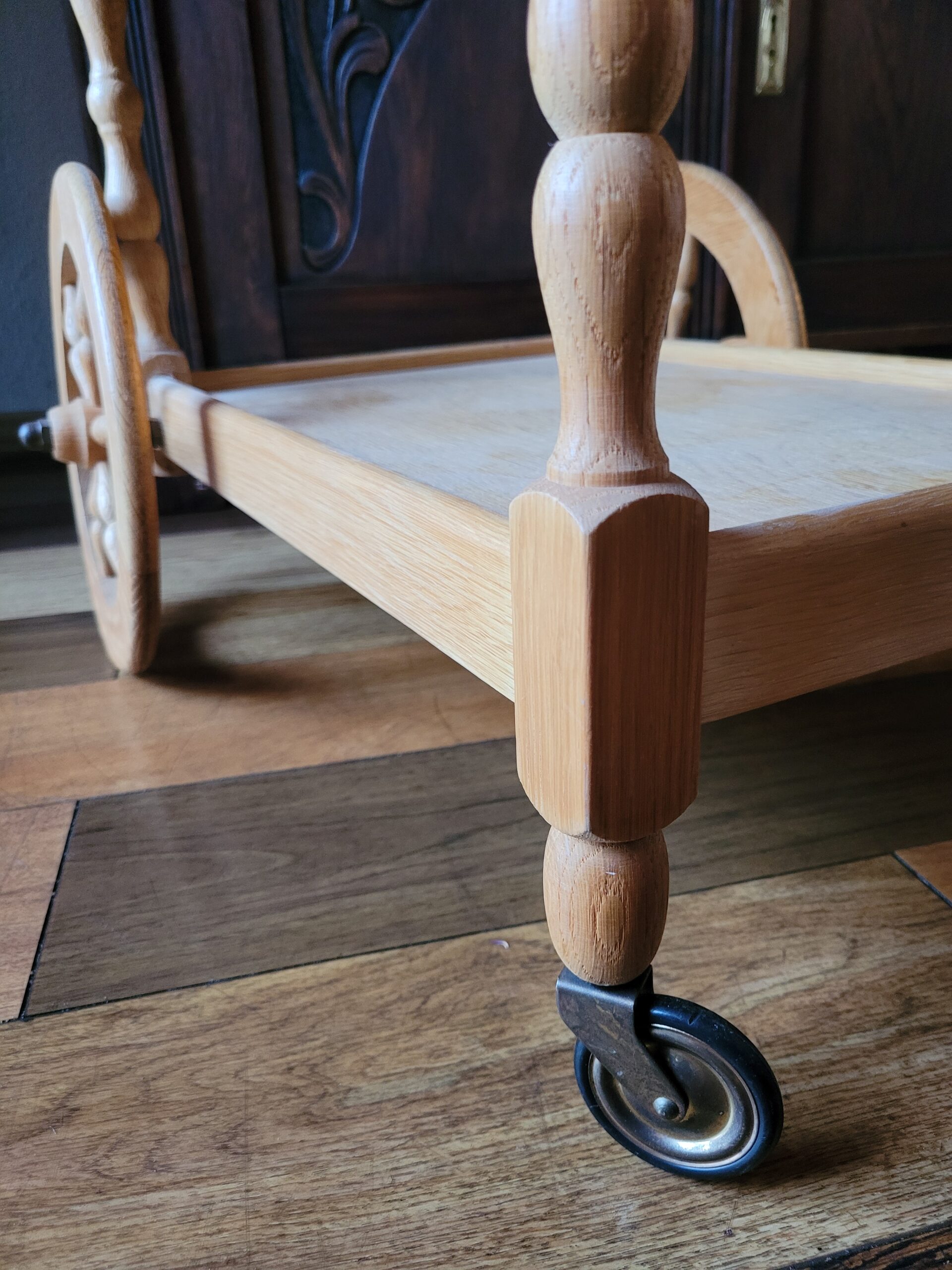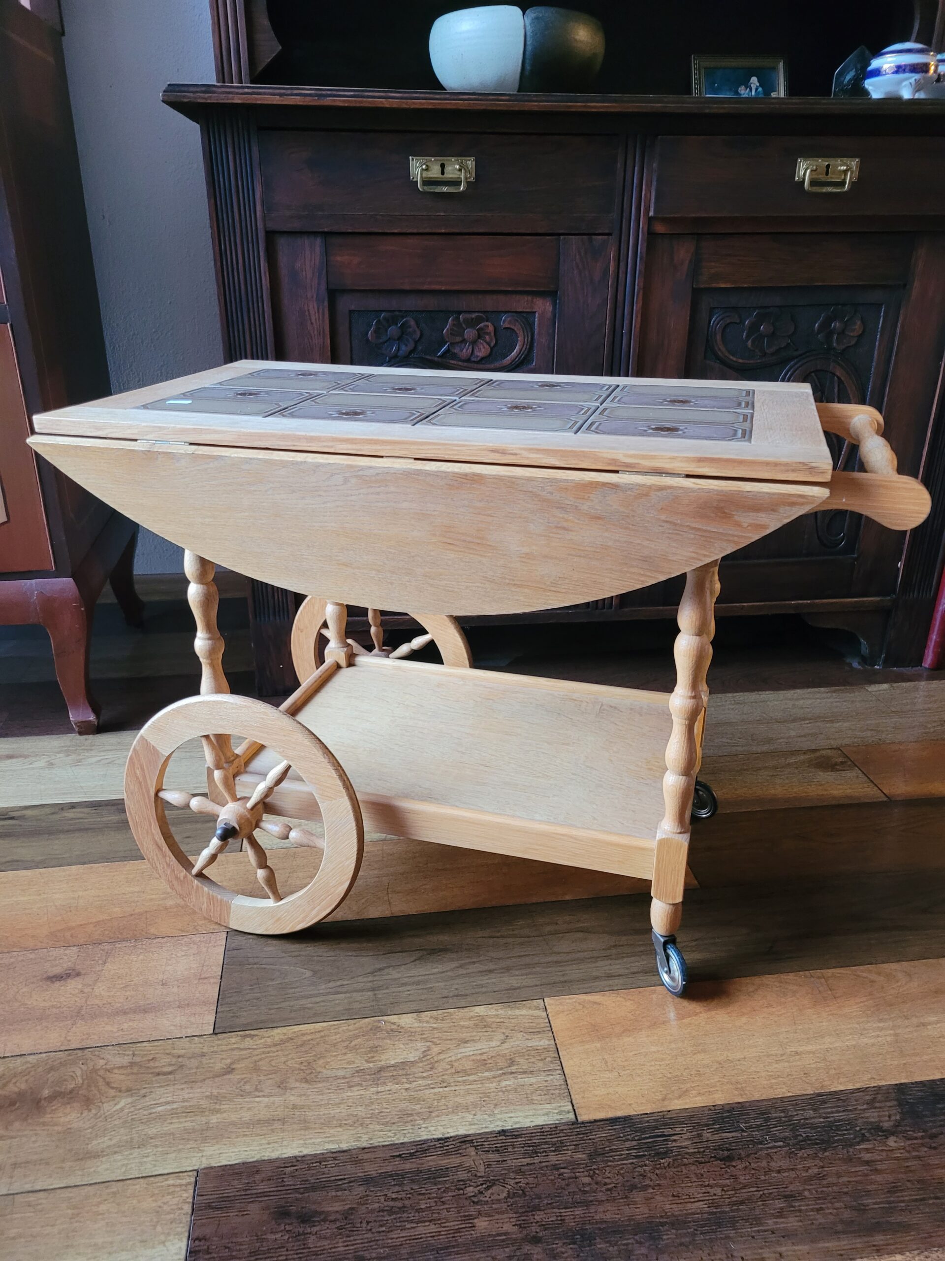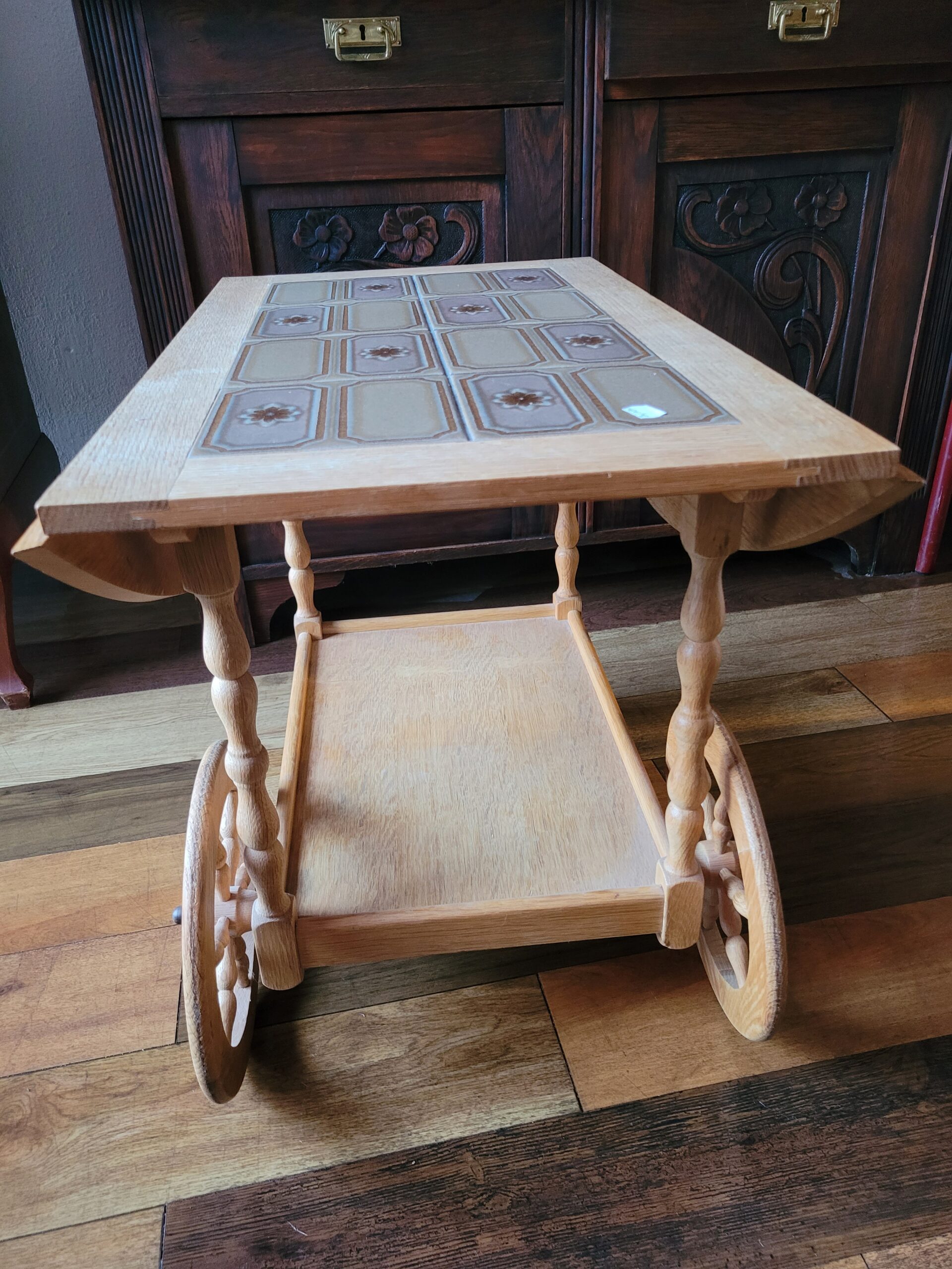 Vintage täispuidust serveerimiskäru. Pealmine osa küljele laiendatav. Liigub sujuvalt. Laud kaetud keraamiliste plaatidega.