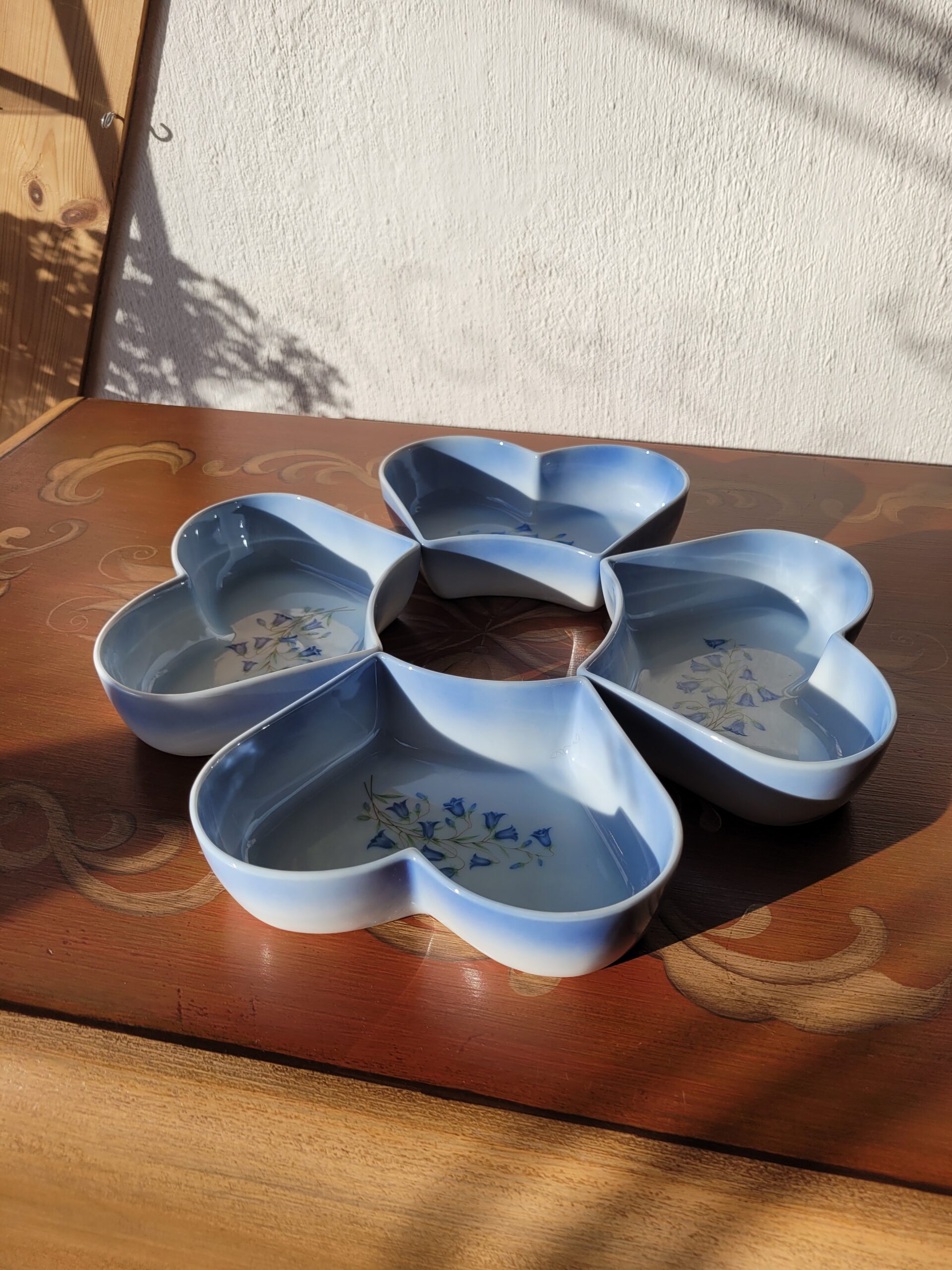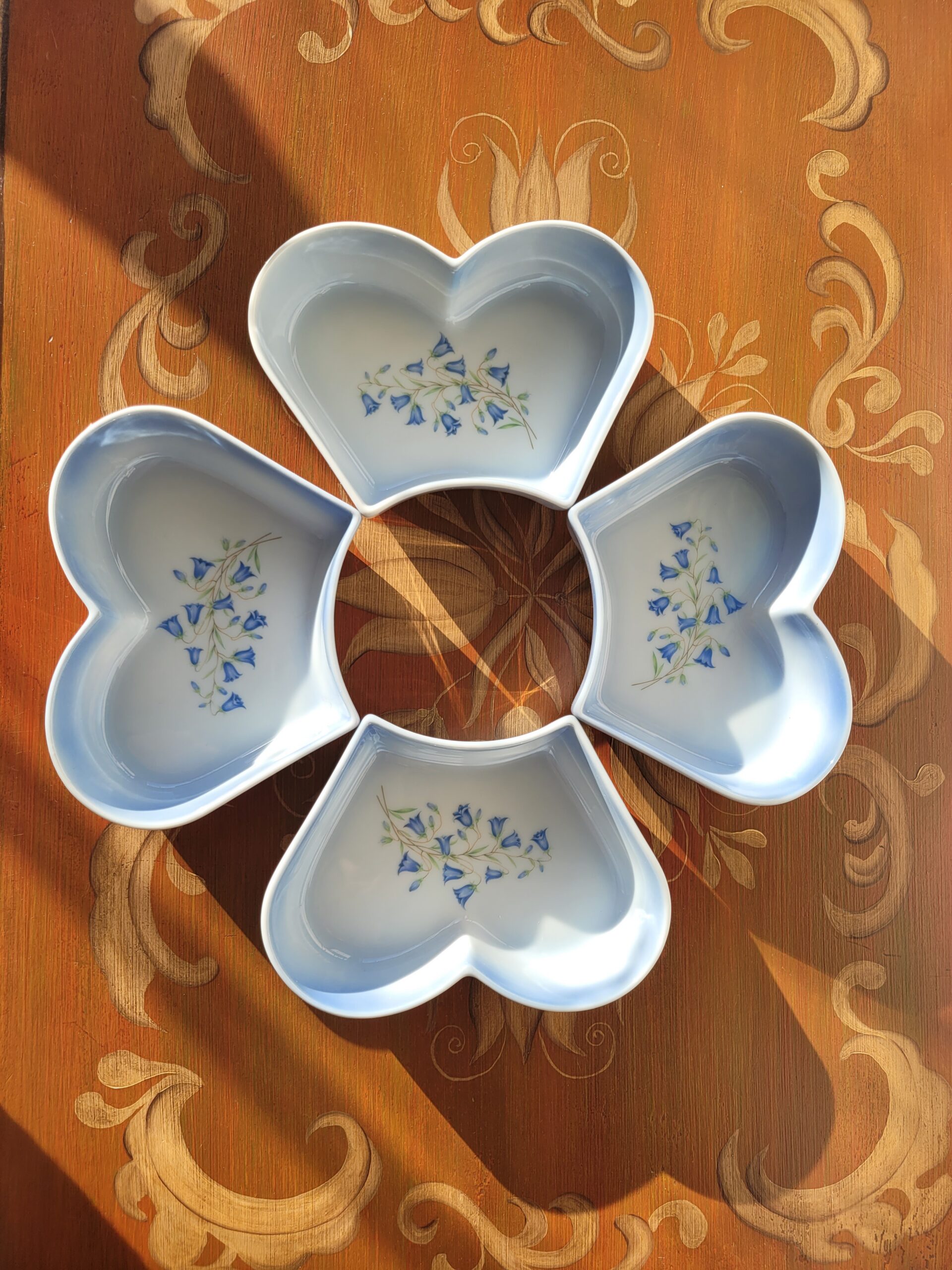 See õrn ja ajatu neljast südamekujulisest kausist koosnev komplekt pärineb hinnanguliselt 1950.–1960. aastatest. Tegemist on klassikalise Inglise portselanitraditsiooni mõjutustega esemega, millele on iseloomulik peen helesinine glasuurserv ning õrn siniste kellukakujuliste lillede dekoor kausi põhjas.