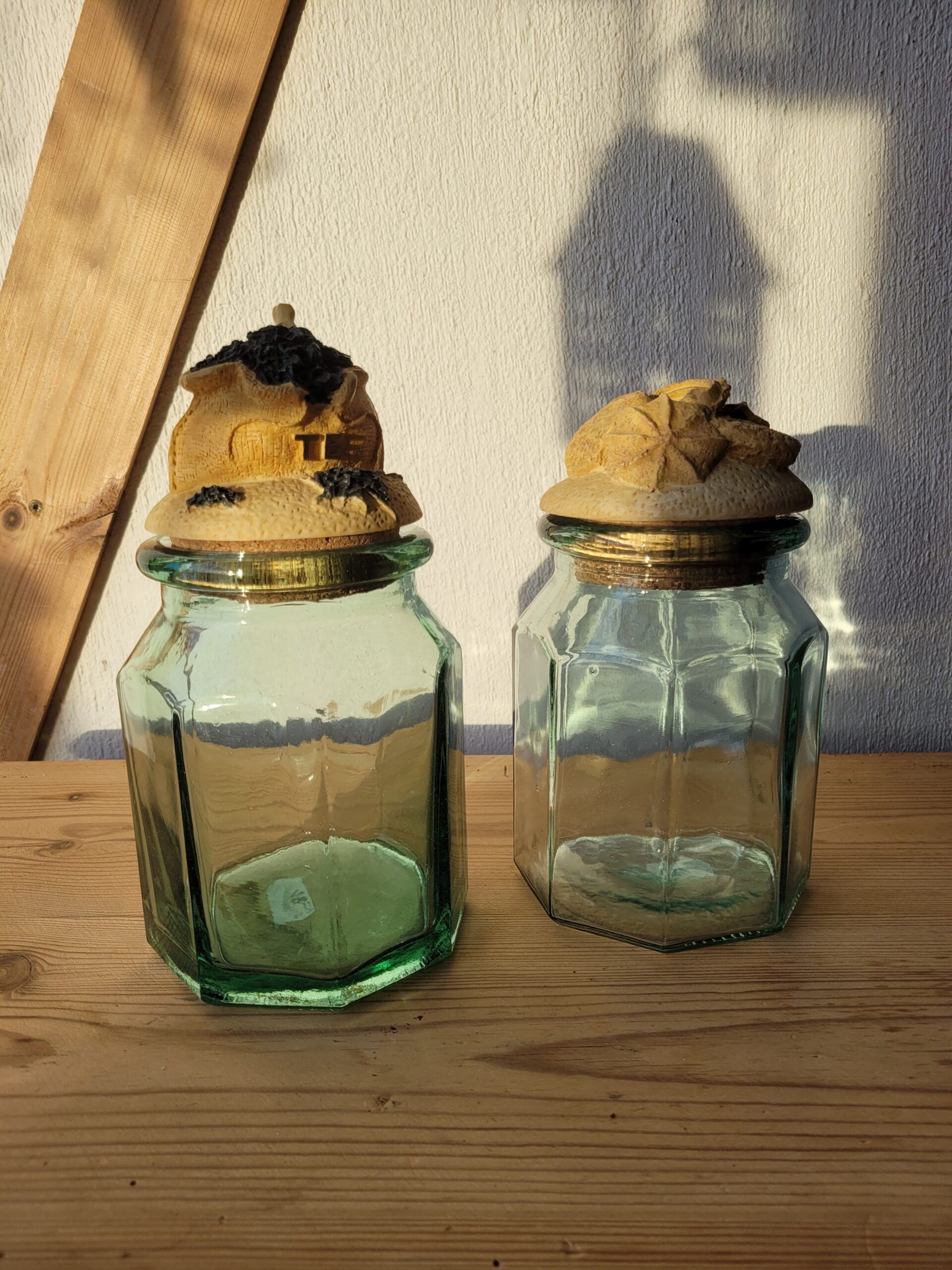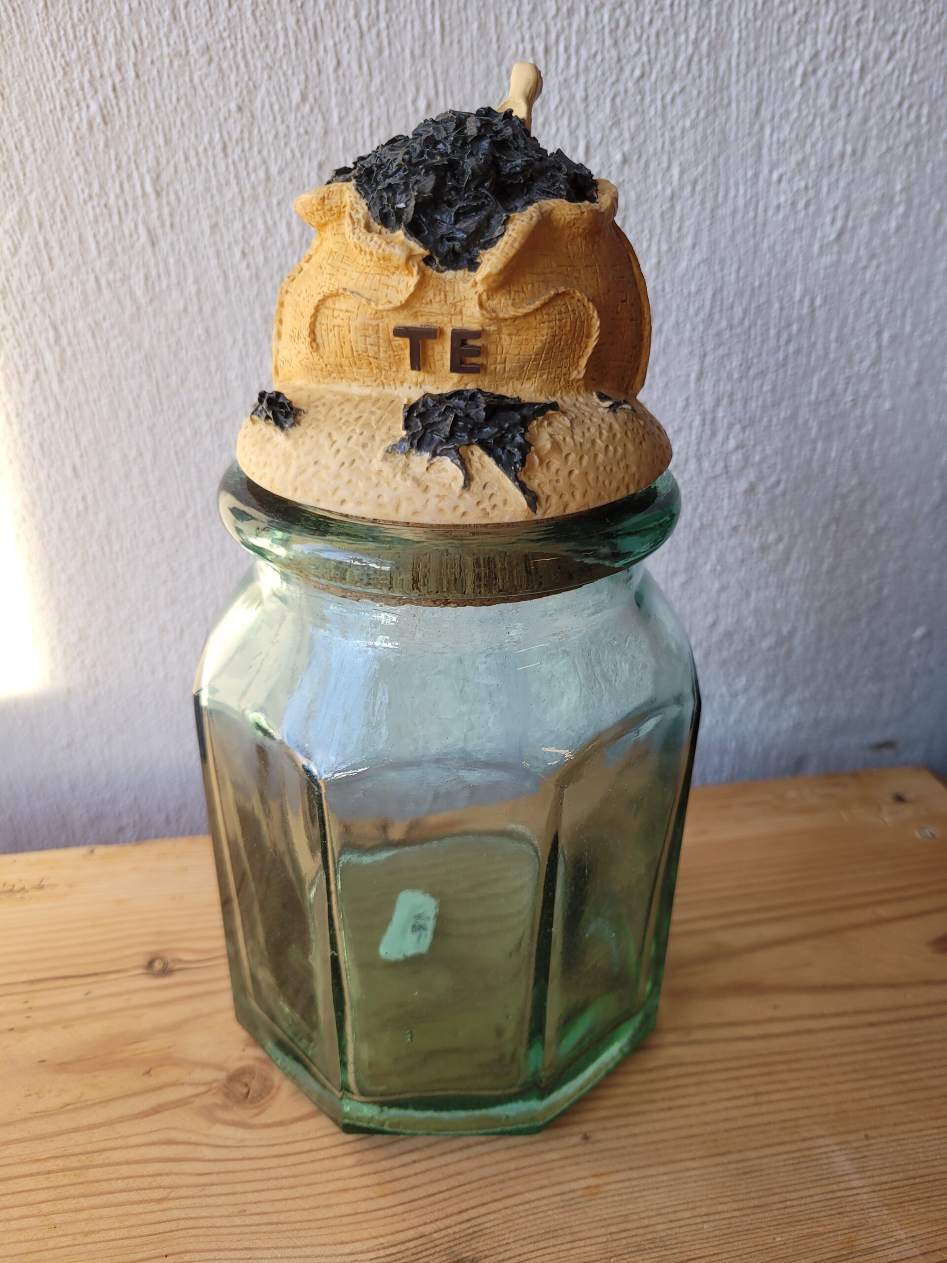 Paksust klaasist purk tee või muu meelepärase hoiustamiseks. Armas pilgupüüdja köögis. Keraamilisel kaanel on kujutatud kotti teepuruga. Korgist kaas tagab õhukindluse ja tooted säilivad purgis värskena.