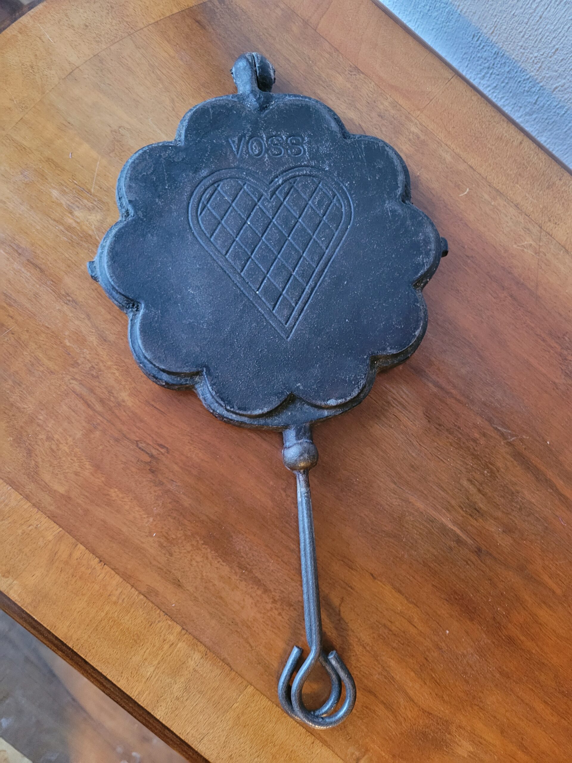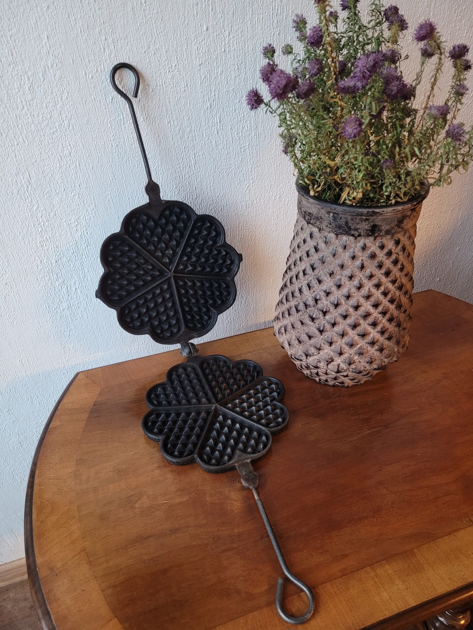 Haruldane leid!  Valmistatud malmist, klassikalise viie südame kujuga. Sobilik gaasipliidile, puupliidile või otse lõkkele. Käsitöö 100 aasta tagusest ajast. Vahvliraud on ümberpööratav, seega vahvel mõlemalt poolt küpsetatav. Päritolu Taani ning algne päritolumaa Saksamaa (Voss Foundry)