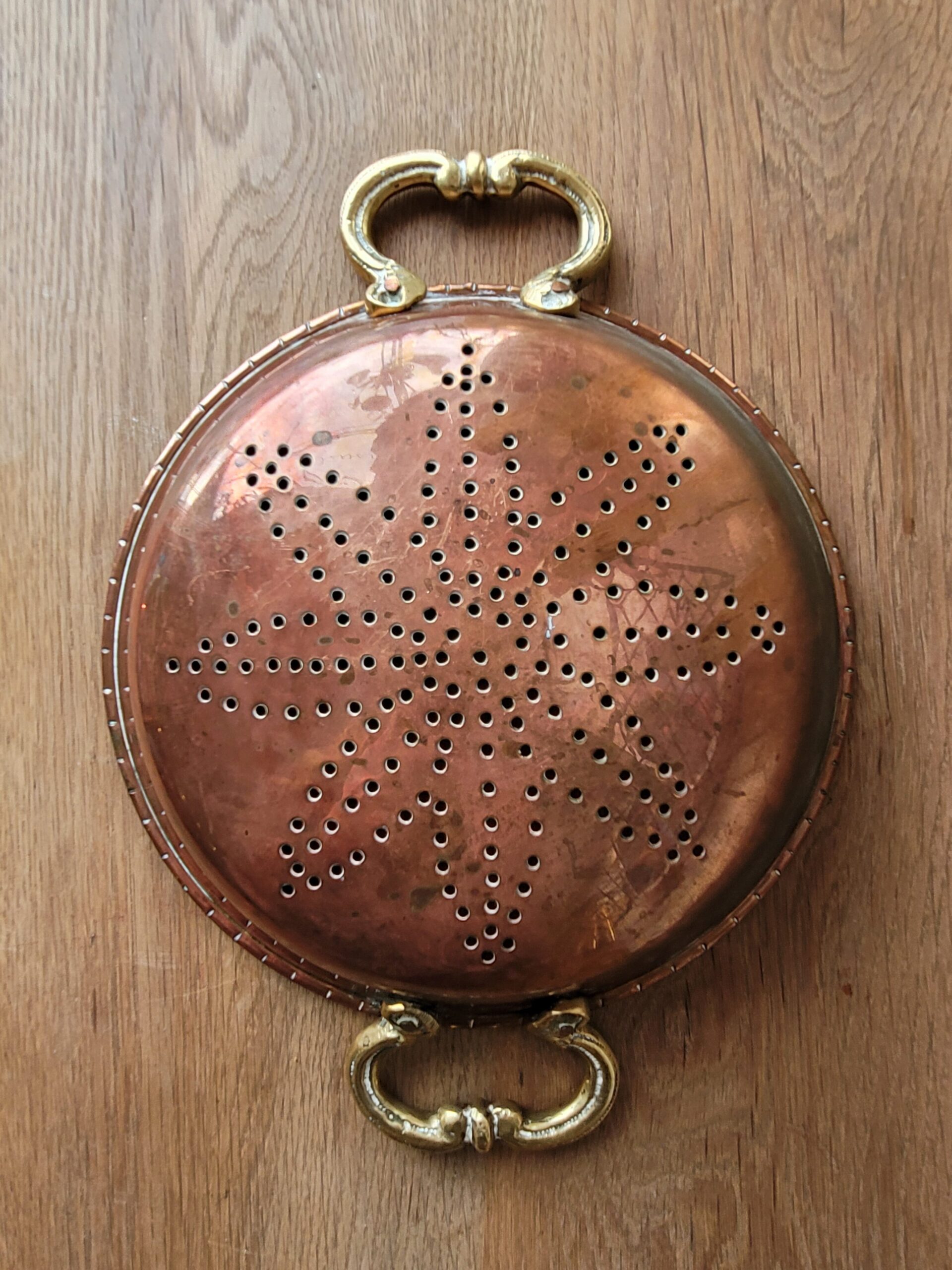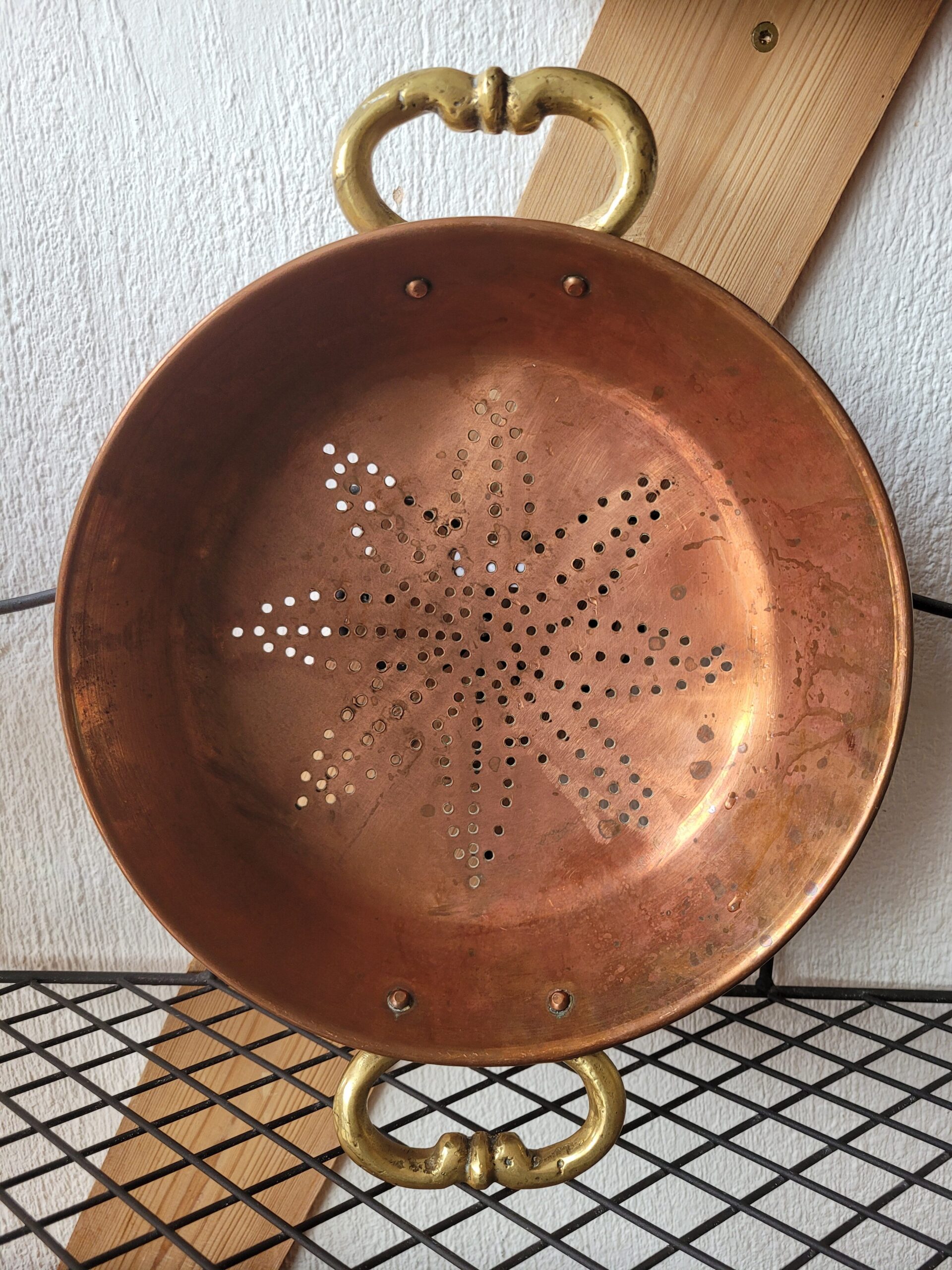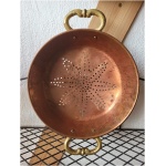 Vanaaegne vasest sõel messing käepidemetega. Sobib suurepäraselt nii köögis kasutamiseks kui ka dekoratiivseks detailiks kodus. Ajatult kaunis ja funktsionaalne ese, mis lisab igale ruumile soojust ja vintage-hõngu.